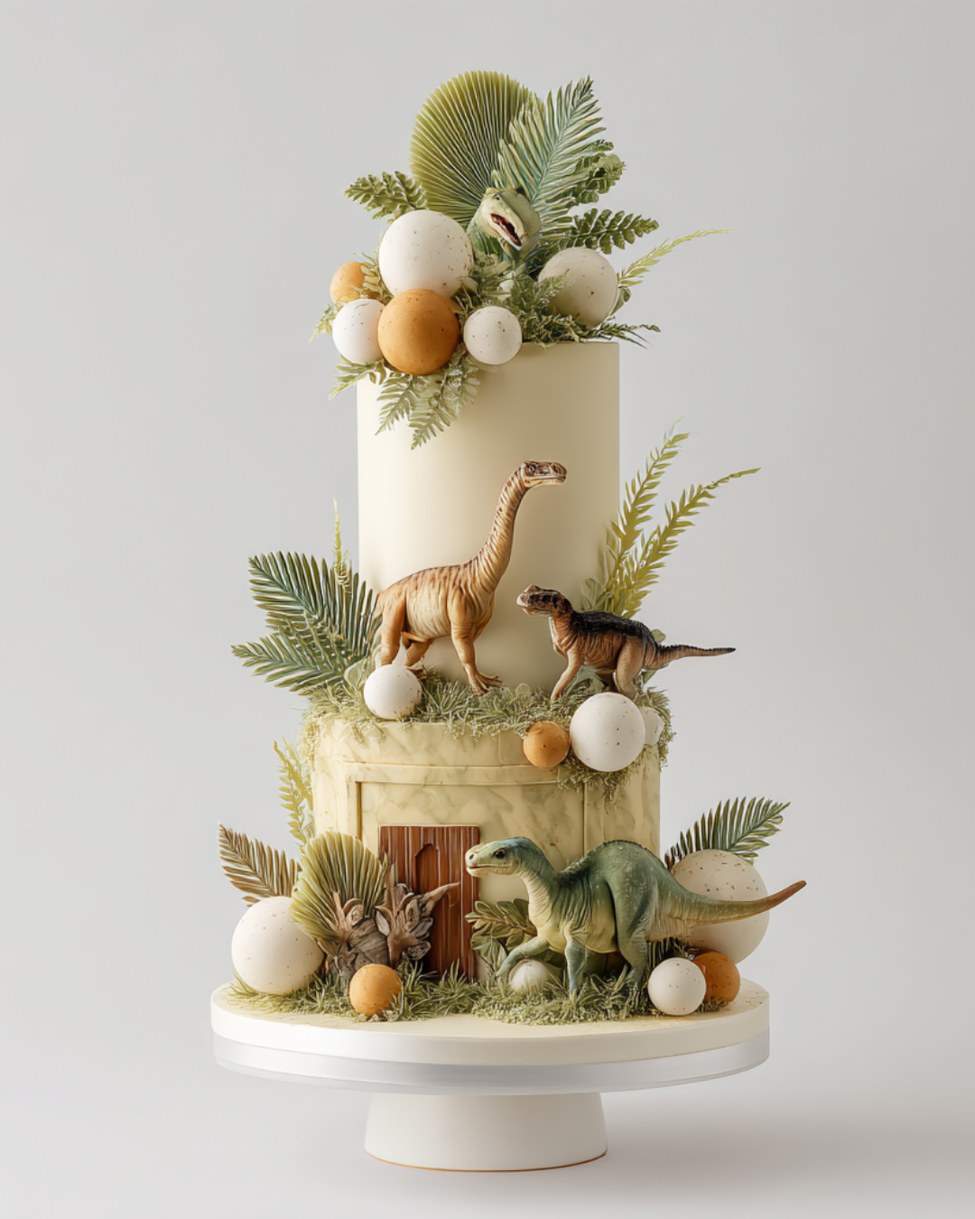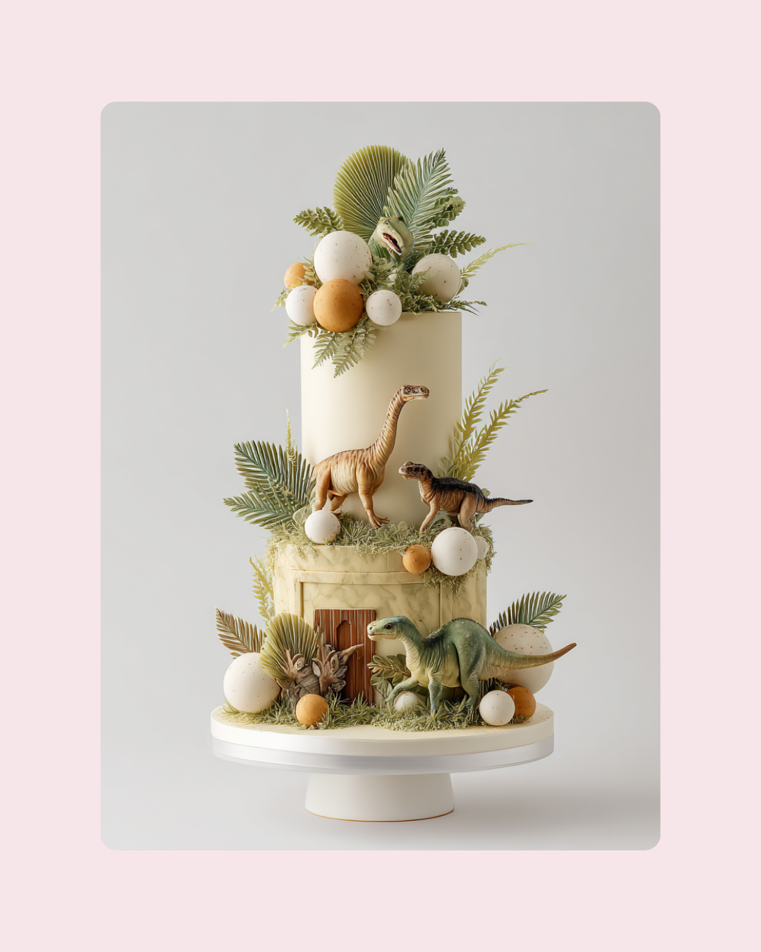 This sculpted dinosaur cake brings adventure and elegance together—blending soft palettes, layered textures, and intentional storytelling.
