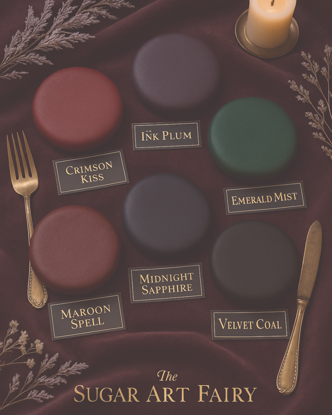 Curated shades inspired by florals, fabrics, and the atmospheric tones that shape TSAF’s couture cakes—not generic primaries, but elevated hues that blend effortlessly.