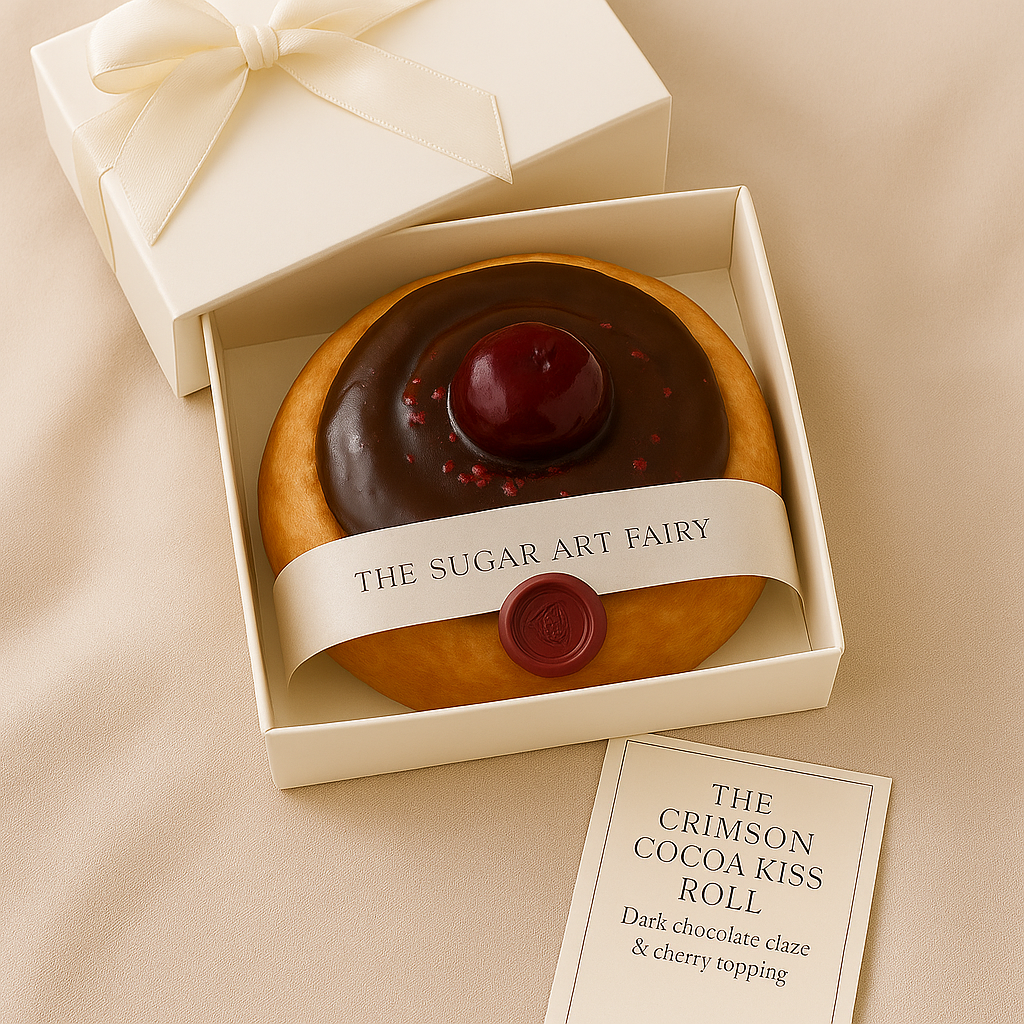 The Crimson Cocoa Kiss Roll is filled with tart cherry preserves and deep chocolate fudge, wrapped in buttery brioche dough and finished with a cherry-infused dark chocolate ganache. It’s intense, indulgent, and finished with a soft shimmer — perfect for cozy date nights, special occasions, or spellbinding self-care.