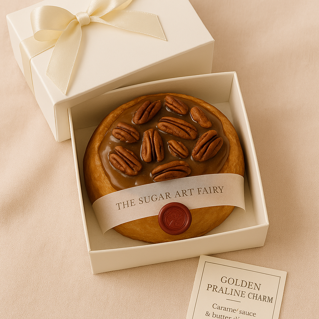 This is comfort with a crown. The Golden Praline Charm is a Southern-inspired swirl of rich brown sugar filling, browned butter, and toasted pecans — all wrapped in soft brioche dough and topped with a silky salted caramel cream cheese glaze. Finished with a touch of edible shimmer, it’s warm, buttery, and beautifully indulgent.