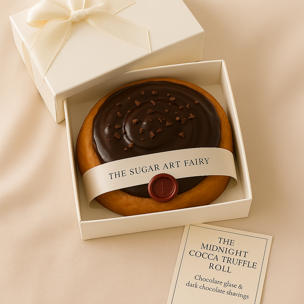 The Midnight Cocoa Truffle Roll is a deep swirl of velvety dark chocolate, espresso-kissed cocoa fudge, and melted chocolate chips wrapped in our signature brioche dough. It’s finished with a glossy dark chocolate ganache glaze and a touch of edible gold shimmer. Rich, bold, and unapologetically indulgent — this is the swirl for serious chocolate lovers.