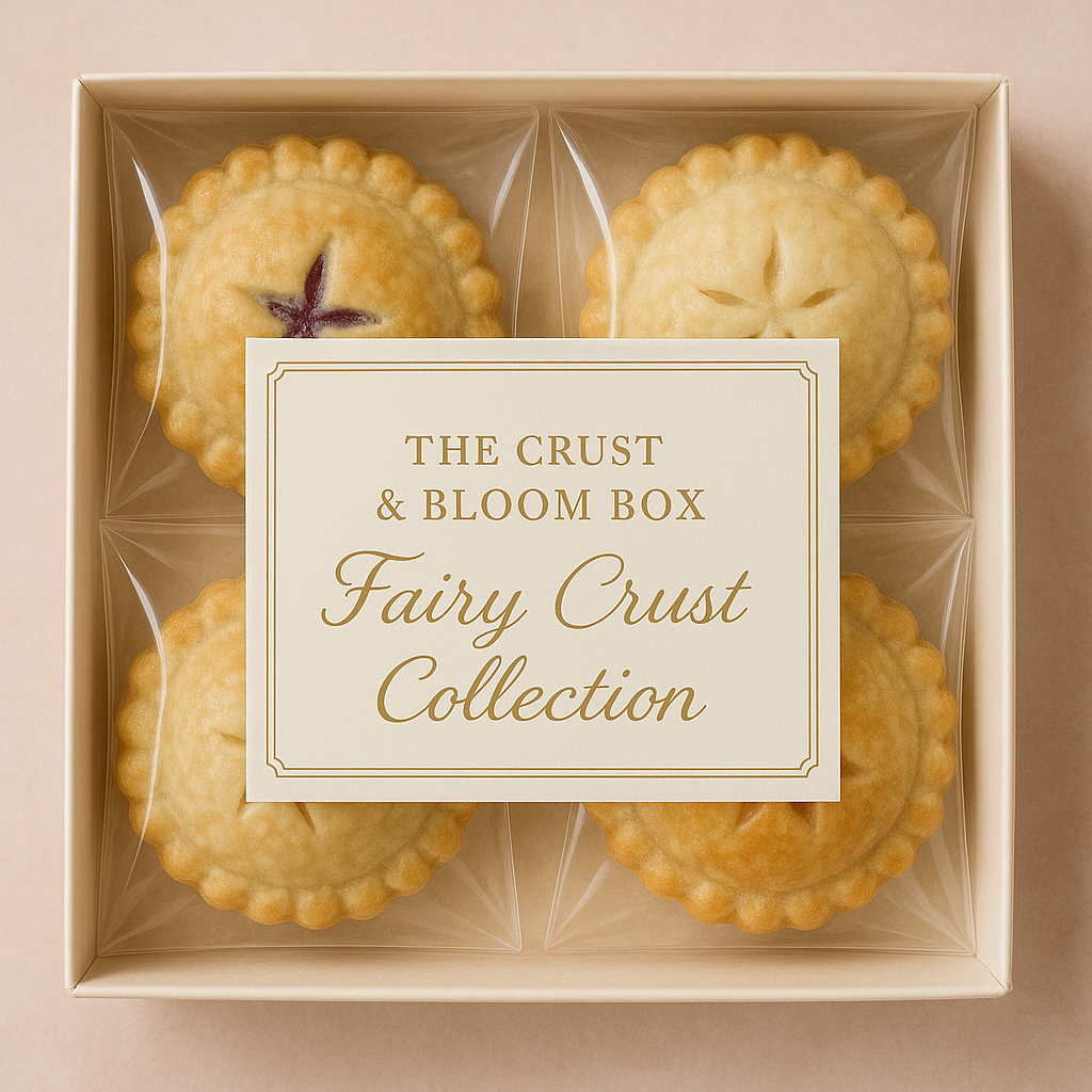 A curated quartet of fairy-forged flavors, The Crust & Bloom Box brings together the bright and the buttery, the floral and the indulgent. Each petite pie is lovingly made from scratch and layered with fruit compotes, custards, or ganache inside our signature vanilla bean butter crust.