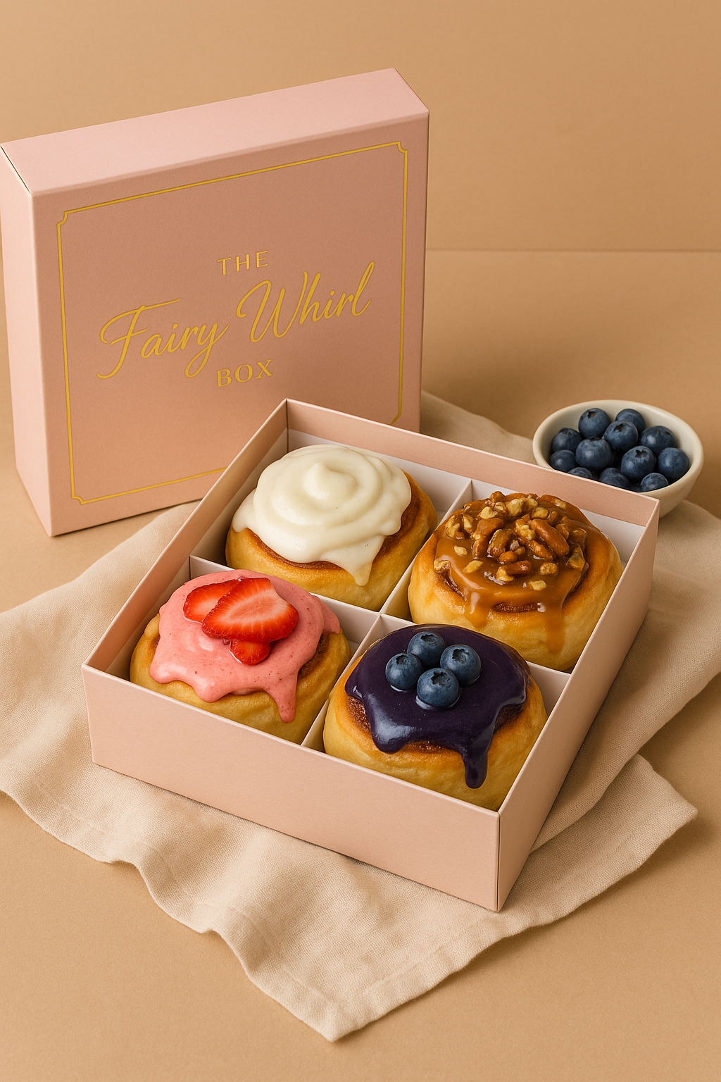 The Fairy Whirl Box is a curated sampler of four oversized brioche cinnamon rolls — each one filled, glazed, and finished with fairy-crafted flair. Whether you’re sending sugar magic to someone special or indulging in a little of everything yourself, this box is the perfect way to explore our most enchanting flavors.